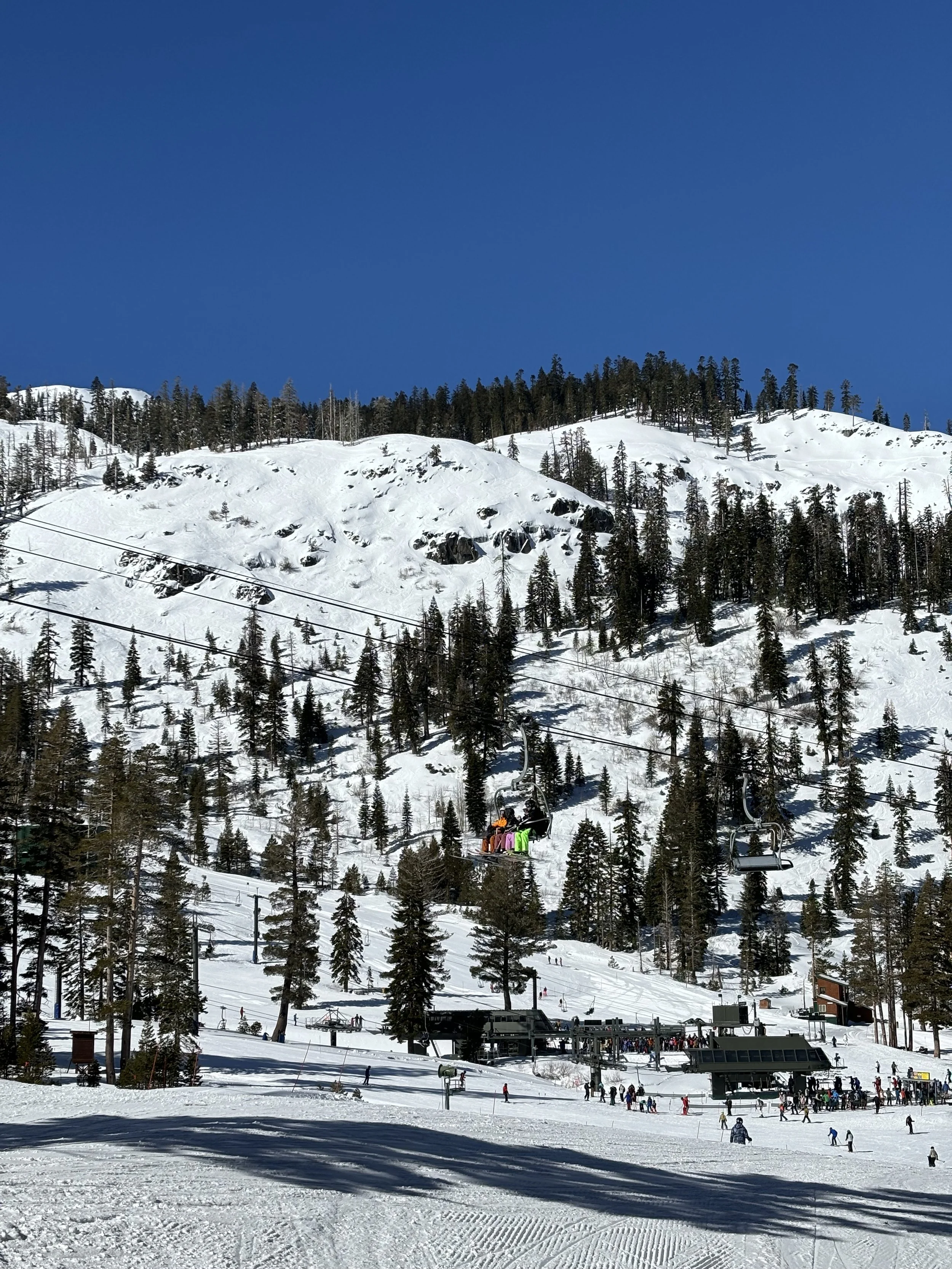 On to the main attraction! Palisades Tahoe = a beginner’s nightmare. I would consider myself an okay skier, mostly sticking to greens and maybe the occasional blue. To survive the day, I suggest taking the Funitel to Gold Coast and skiing down a short blue to the Big Blue Express express. Once you get to the top there are a ton of doable greens such as Snow Flower, Mules Ear (my fav), Monkey Flower and Lupine. I pretty much spent the day in that area and took the Funitel down. If you attempt to take a blue or black down the mountain it could be icy at the bottom so beware. I also enjoyed the front of Alpine Side. I was able to do Meadow and Subway.